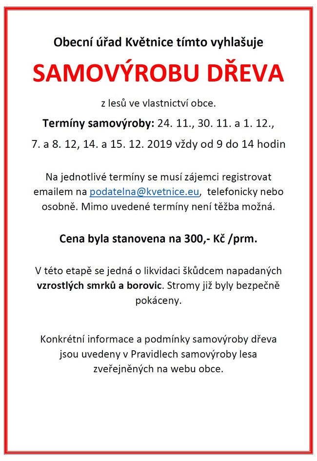 Zájemci se musí na jednotlivé termíny registrovat na OÚ Květnice nebo na podatelna@kvetnice.eu