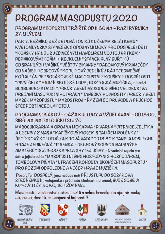 Občanské sdružení Sosák si Vás dovoluje pozvat na Masopust 2020 s tématem Sosákovská masopustní zkouška z dospělosti.