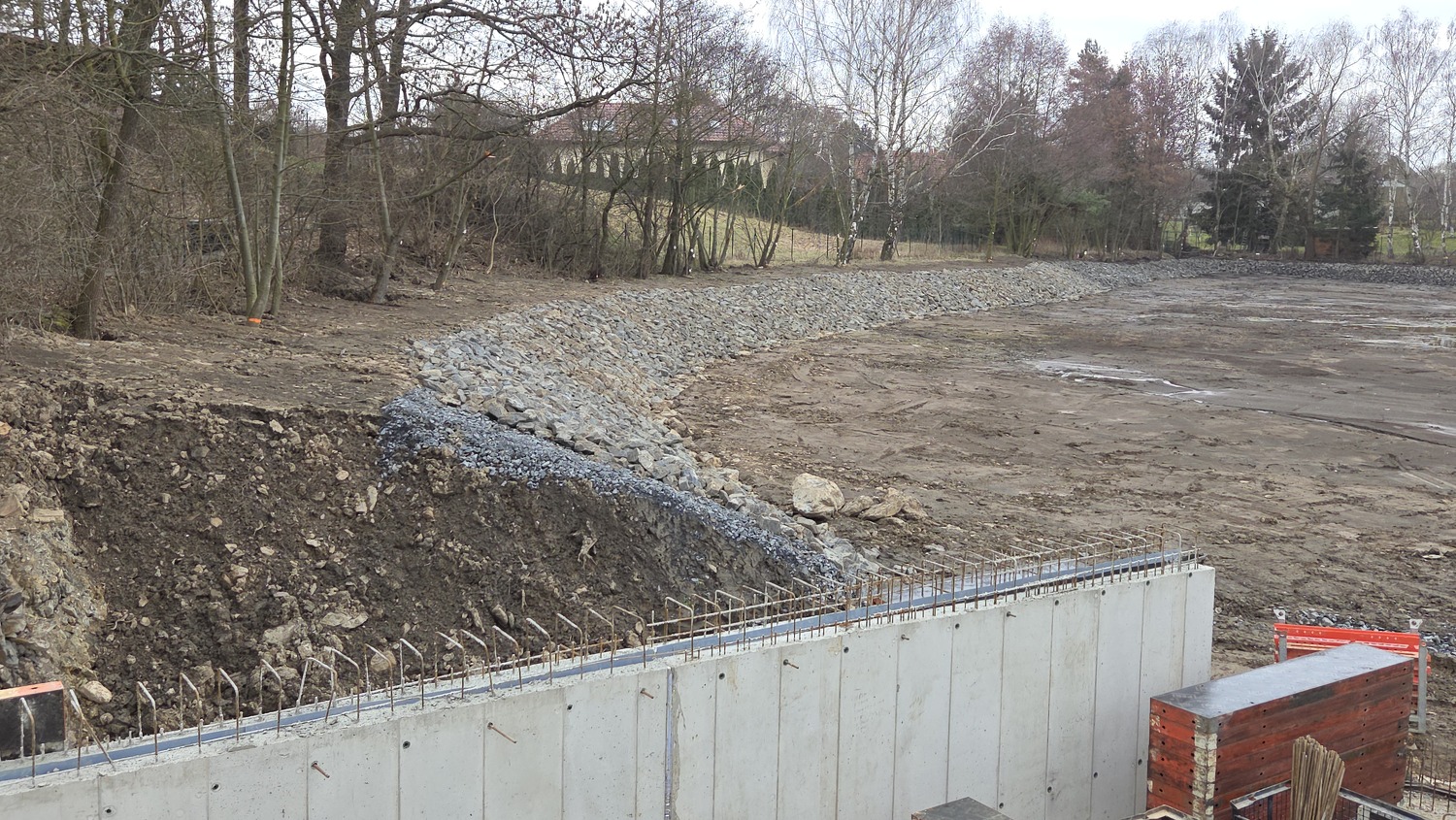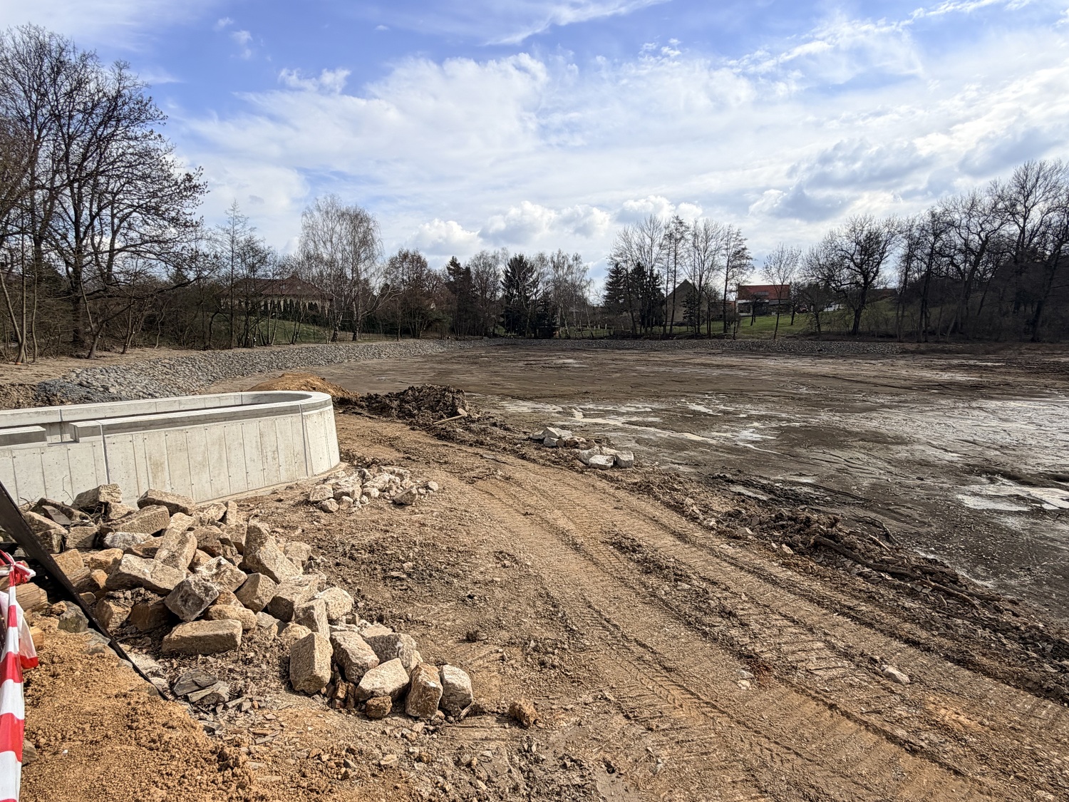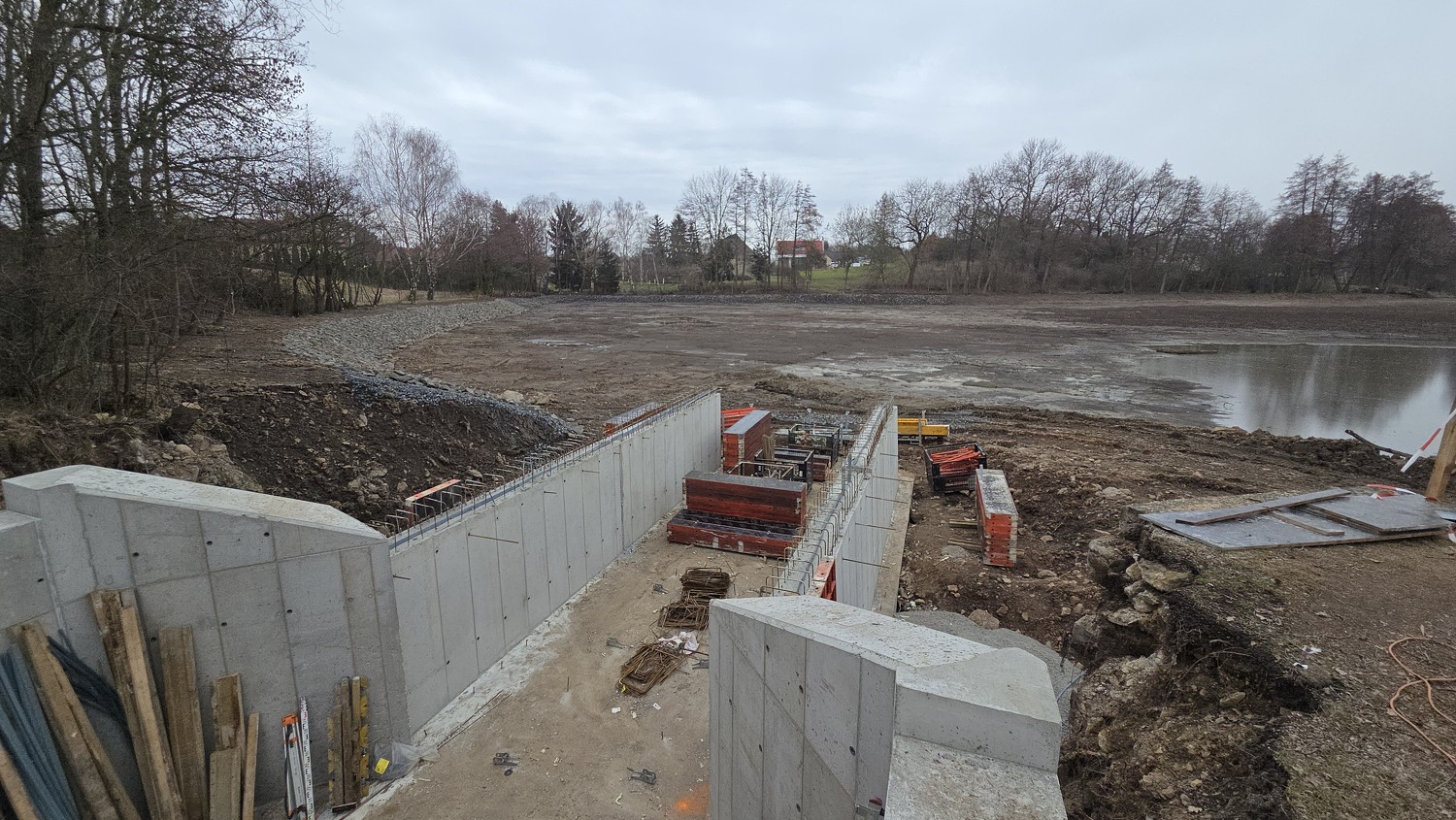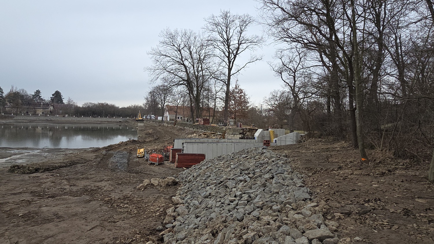 - Aktuálně zde probíhají práce na modelaci břehů a jejich zpevňování lomovým kamenem, pokračuje betonování základové desky, osazování armatur a realizace bezpečnostního přelivu. Současně se pravidelně konají kontrolní dny stavby, při nichž je kontrolován postup prací, technické řešení i soulad s projektovou dokumentací a podmínkami dotčených orgánů.