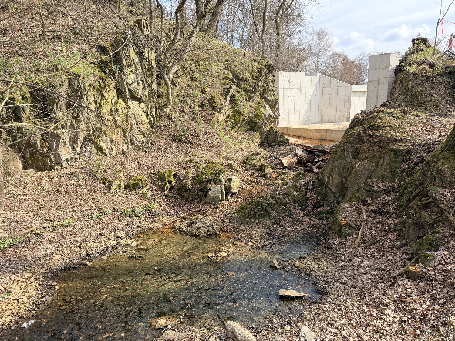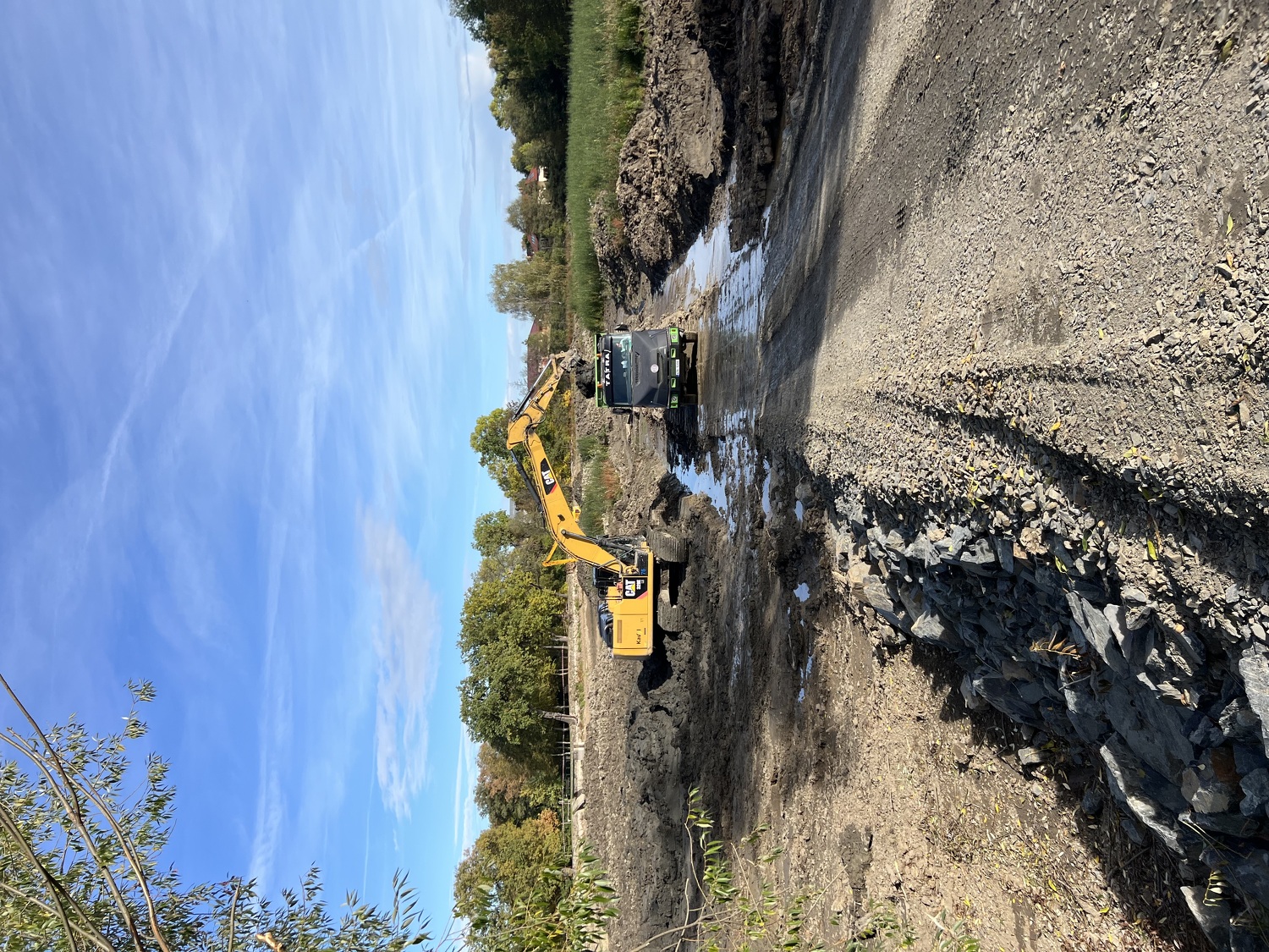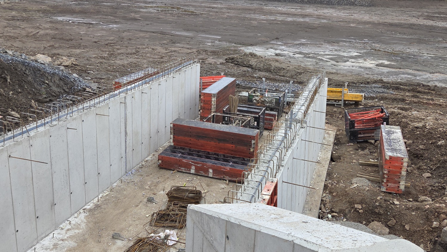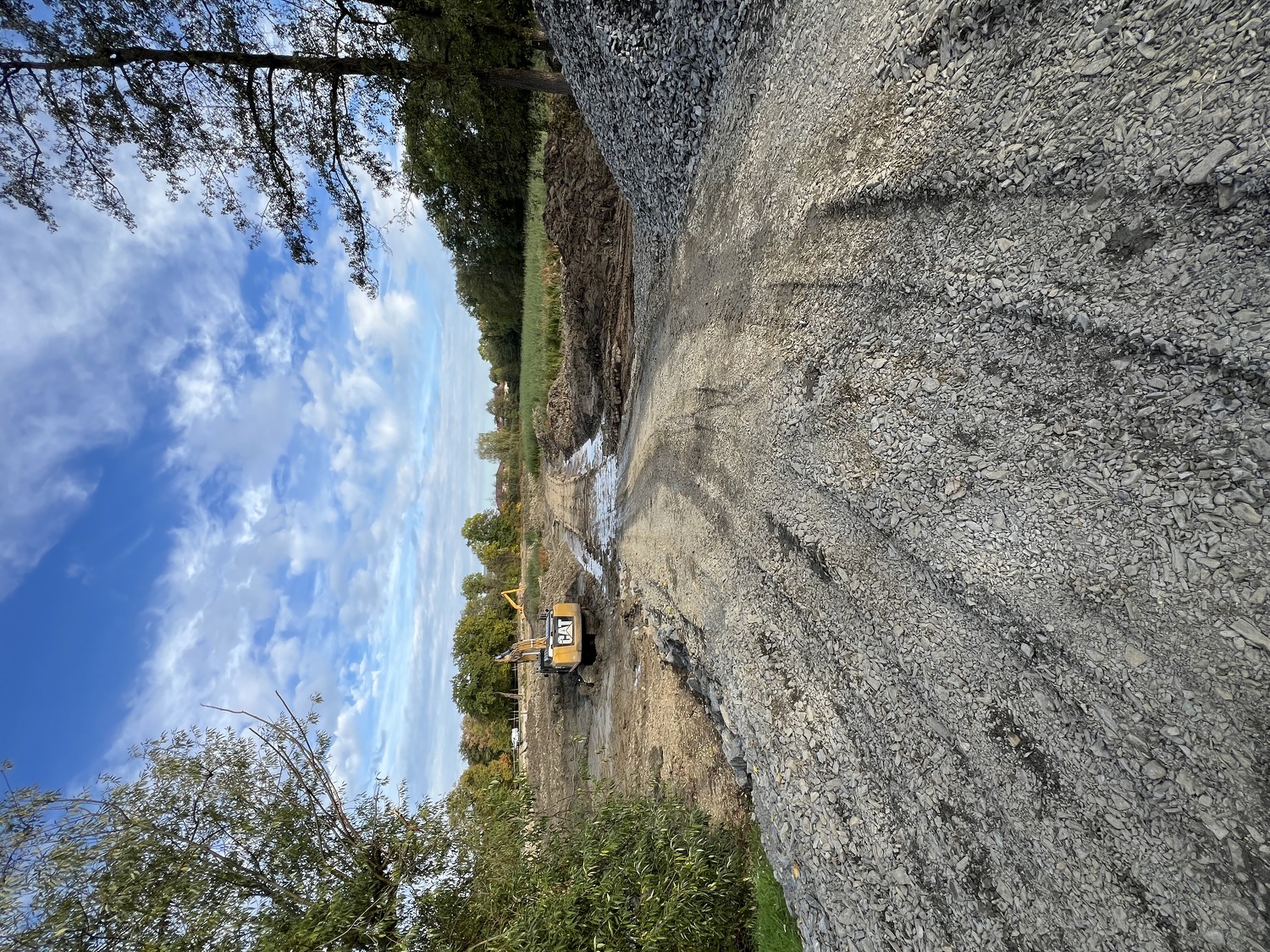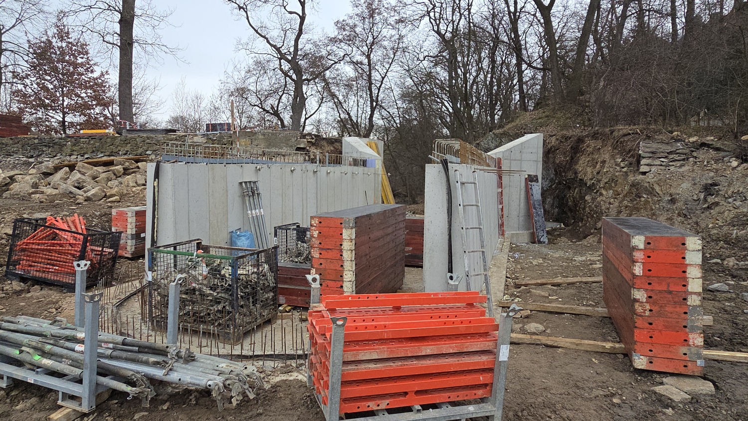 - Aktuálně zde probíhají práce na modelaci břehů a jejich zpevňování lomovým kamenem, pokračuje betonování základové desky, osazování armatur a realizace bezpečnostního přelivu. Současně se pravidelně konají kontrolní dny stavby, při nichž je kontrolován postup prací, technické řešení i soulad s projektovou dokumentací a podmínkami dotčených orgánů.