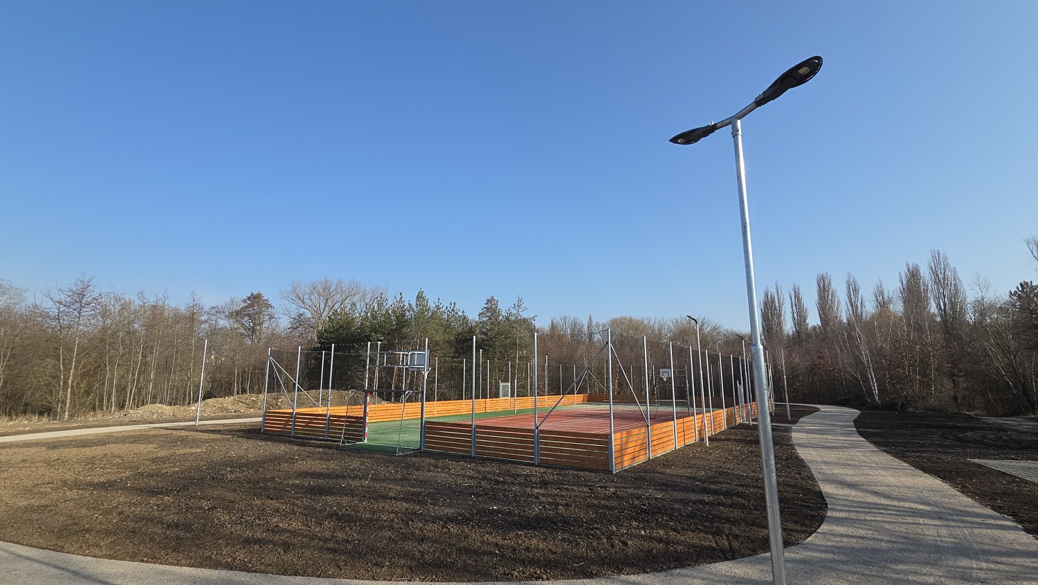 - V roce 2025 dobudujeme zbývající části, tj. venkovní posilovna a amfiteátr pro letní kino nebo koncerty a zejména dočasné zázemí (šatny a WC). Zázemí bohužel nebude možné vybudovat již letos, protože zatím nejsou zajištěny nezbytné sítě.