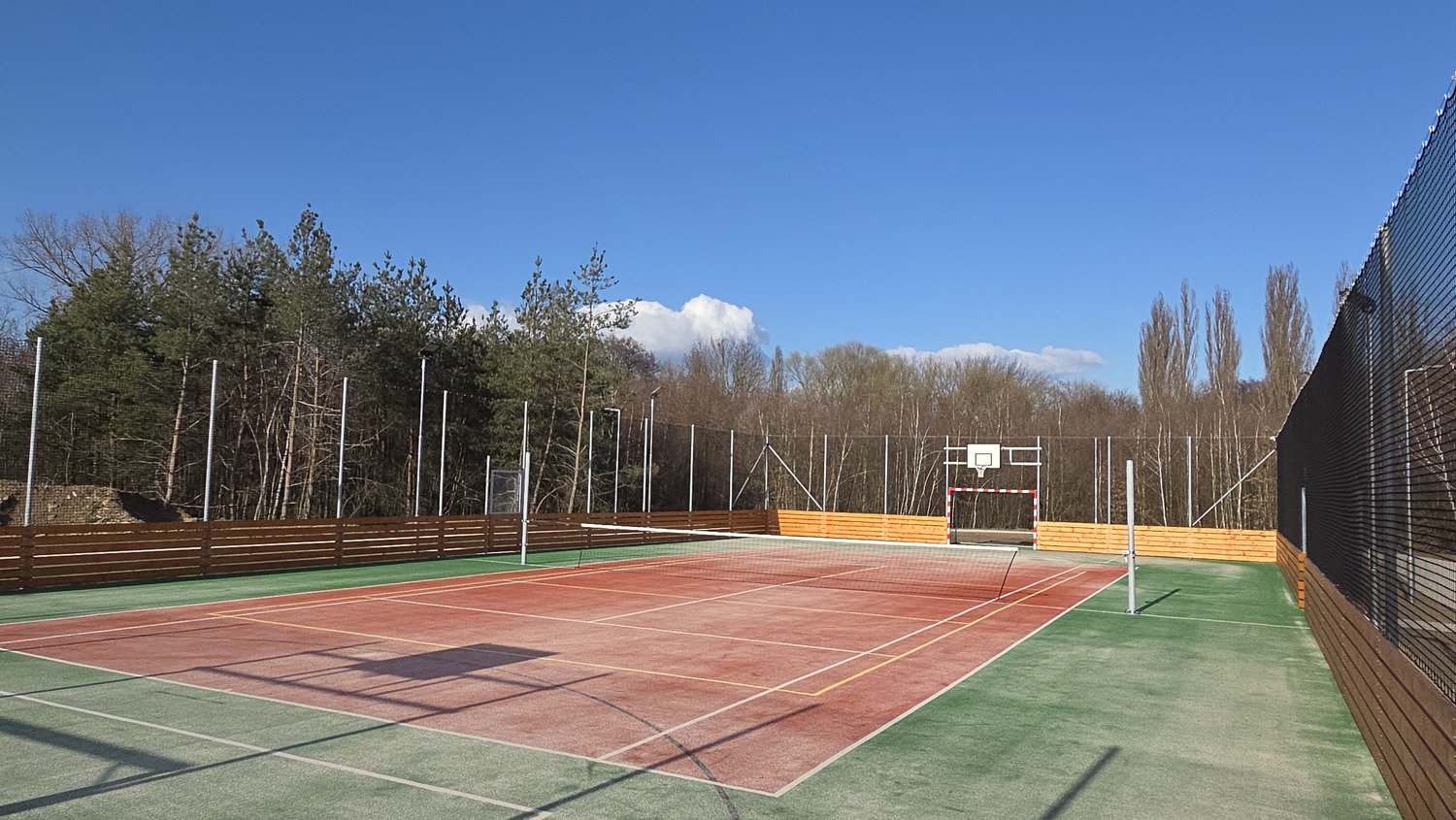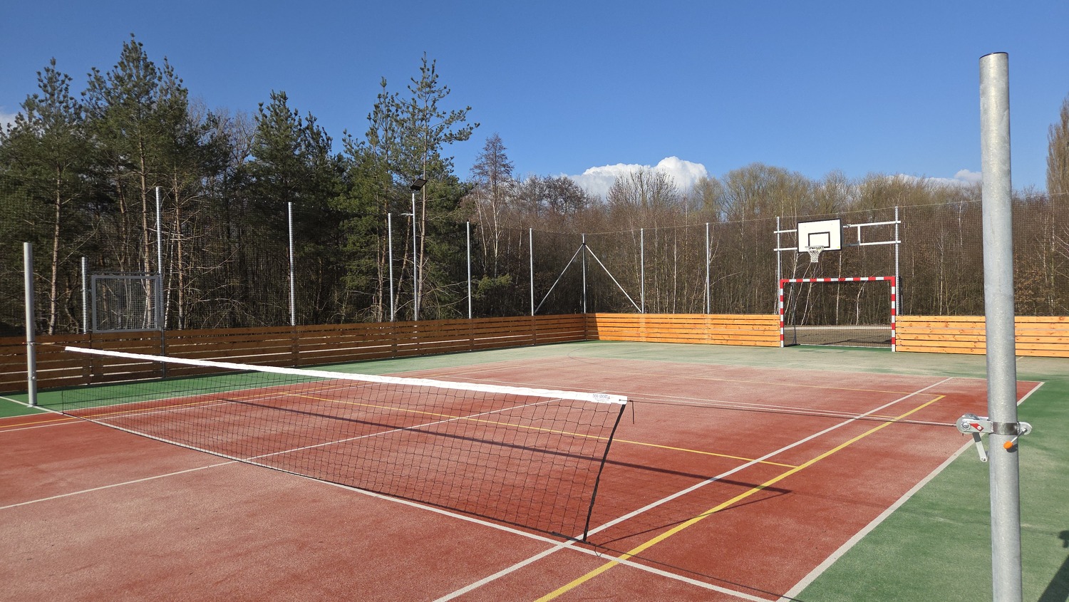 - Víceúčelové hřiště 36 x 18 m s mantinely a oplocením vybavené lajnováním a sadou na volejbal, nohejbal, basketbal, tenis a malou kopanou