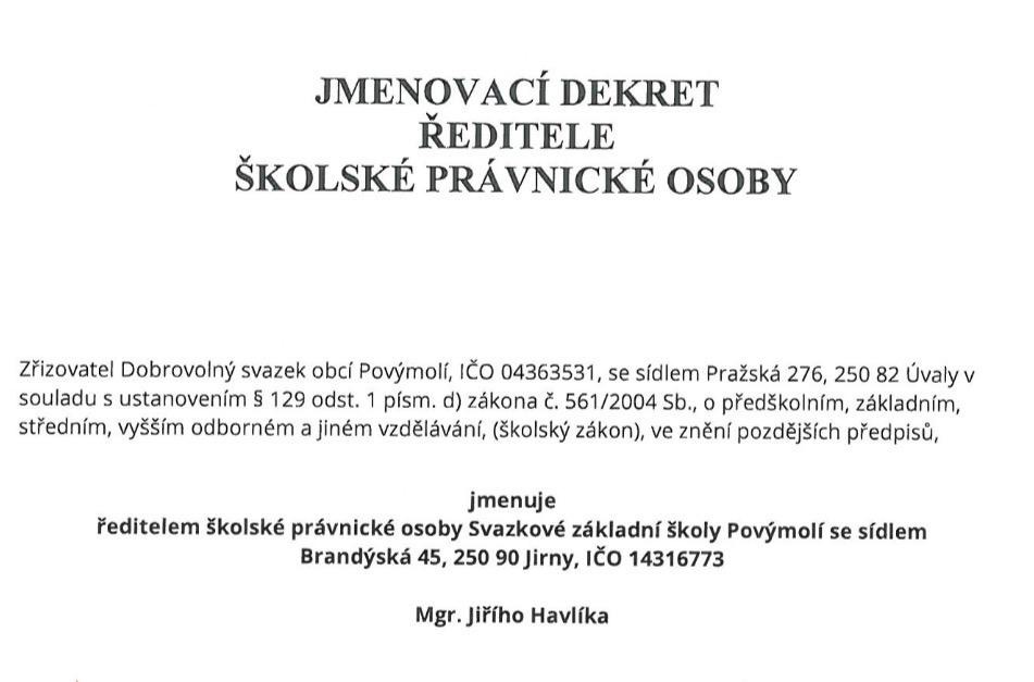 Jmenování proběhlo v souladu s ustanovením § 129 odst. 1 písm. d) zákona č. 561/2004 Sb., školský zákon, ve znění pozdějších předpisů.